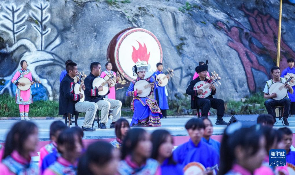 演员在威宁彝族回族苗族自治县火把节活动上演奏月琴(8月10日摄)。