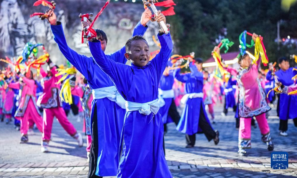 小朋友在威宁彝族回族苗族自治县火把节活动上表演铃铛舞(8月10日摄)。