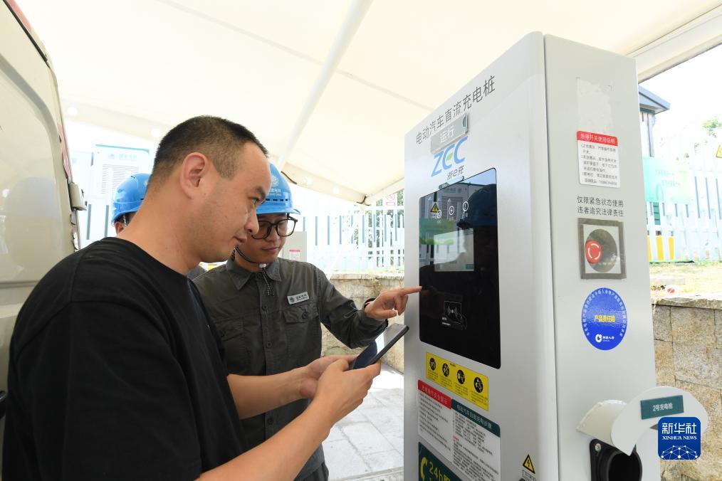 8月11日,游客在安吉余村一处停车场为电动车充电。