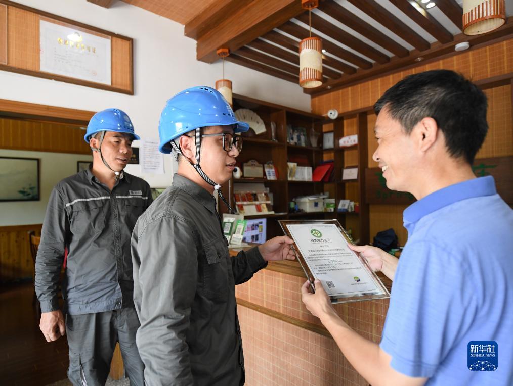 8月11日,电力工作人员给余村的一家民宿颁发绿证。