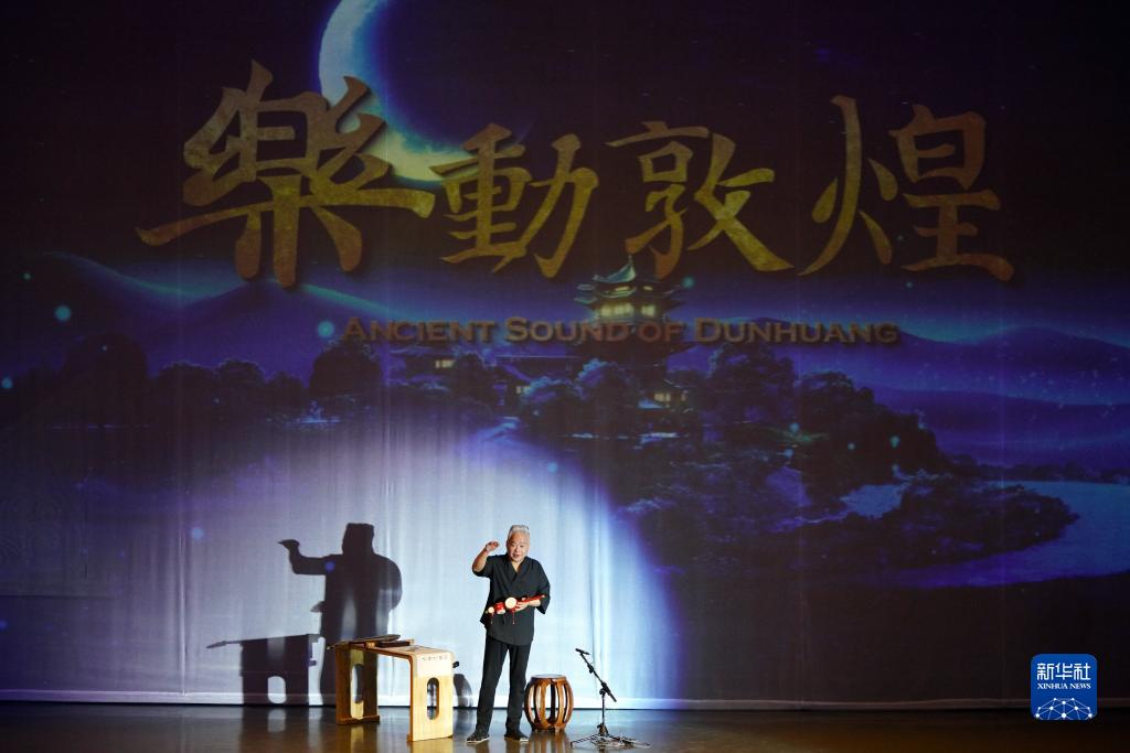 8月9日,在《乐动敦煌》演出现场,敦煌古乐全球推广大使、国乐艺术家方锦龙在向观众介绍传统音乐。