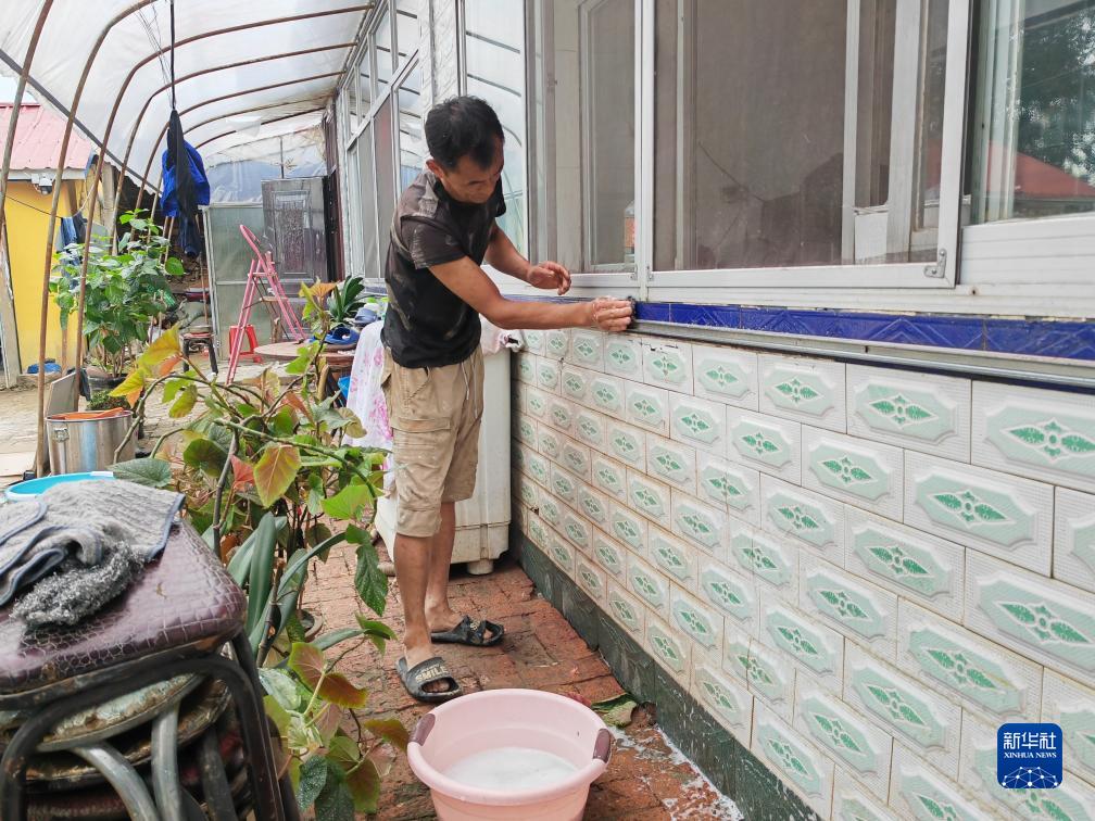8月11日,黑龙江省尚志市元宝镇元宝村村民在清理洪水过后留在房屋墙壁上的淤泥。