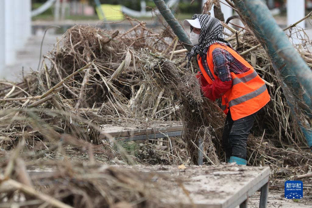 8月11日,在黑龙江省尚志市尚志大街附近,环卫工人在清理洪水冲来的杂物。