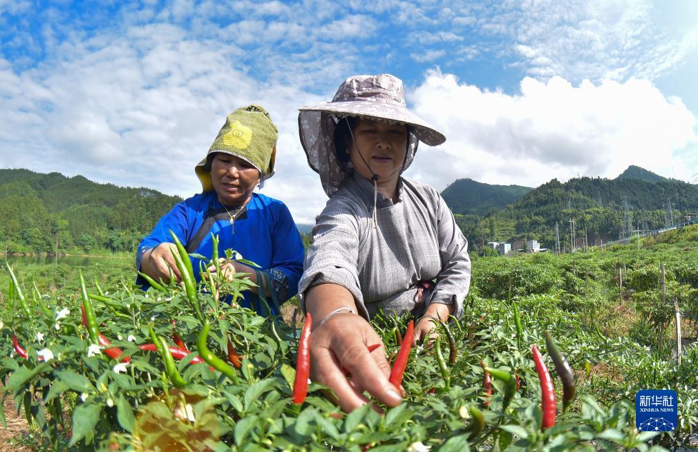 8月11日,在贵州省黔东南苗族侗族自治州从江县下江镇平江村辣椒种植基地,村民在采摘辣椒。
