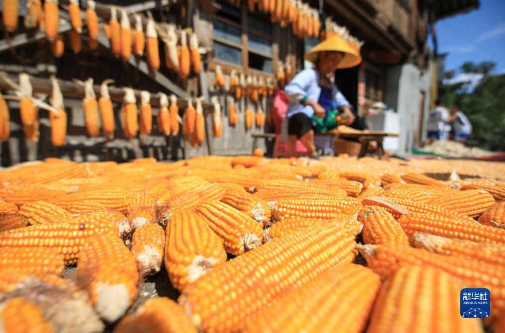 8月11日,在贵州省黔东南苗族侗族自治州从江县往洞镇增冲村,村民在晾晒玉米。