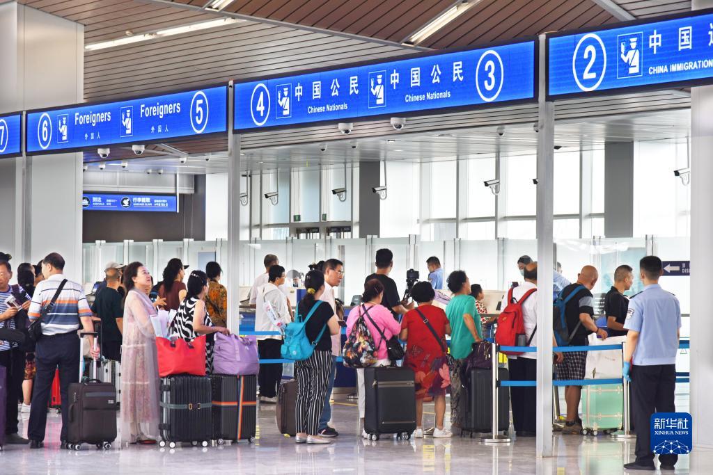 8月11日,旅客在青岛邮轮母港客运码头排队办理边检出境手续。