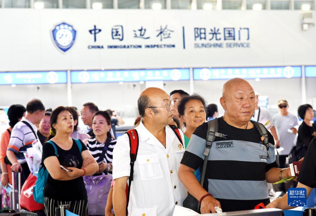 8月11日,旅客在青岛邮轮母港客运码头排队办理边检出境手续。