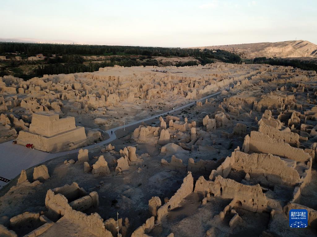 8月11日拍摄的夕阳下的交河故城(无人机照片)。