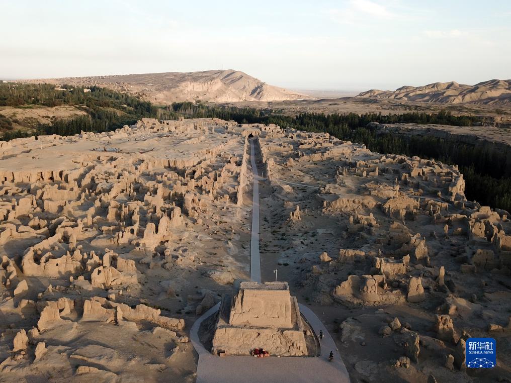 8月11日拍摄的夕阳下的交河故城(无人机照片)。