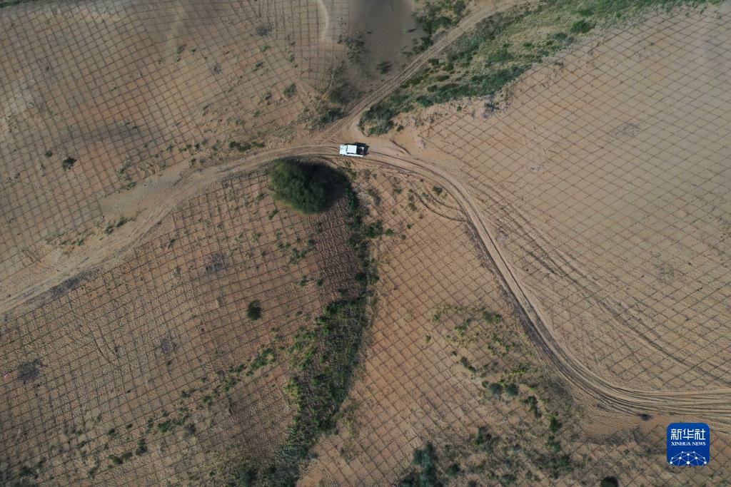 8月11日,运载沙障原材料——沙柳条的车辆在达拉特旗境内的库布其沙漠中行驶(无人机照片)。