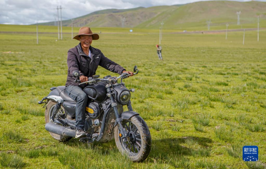 8月11日,次扎达在羌塘草原上骑摩托车出行。