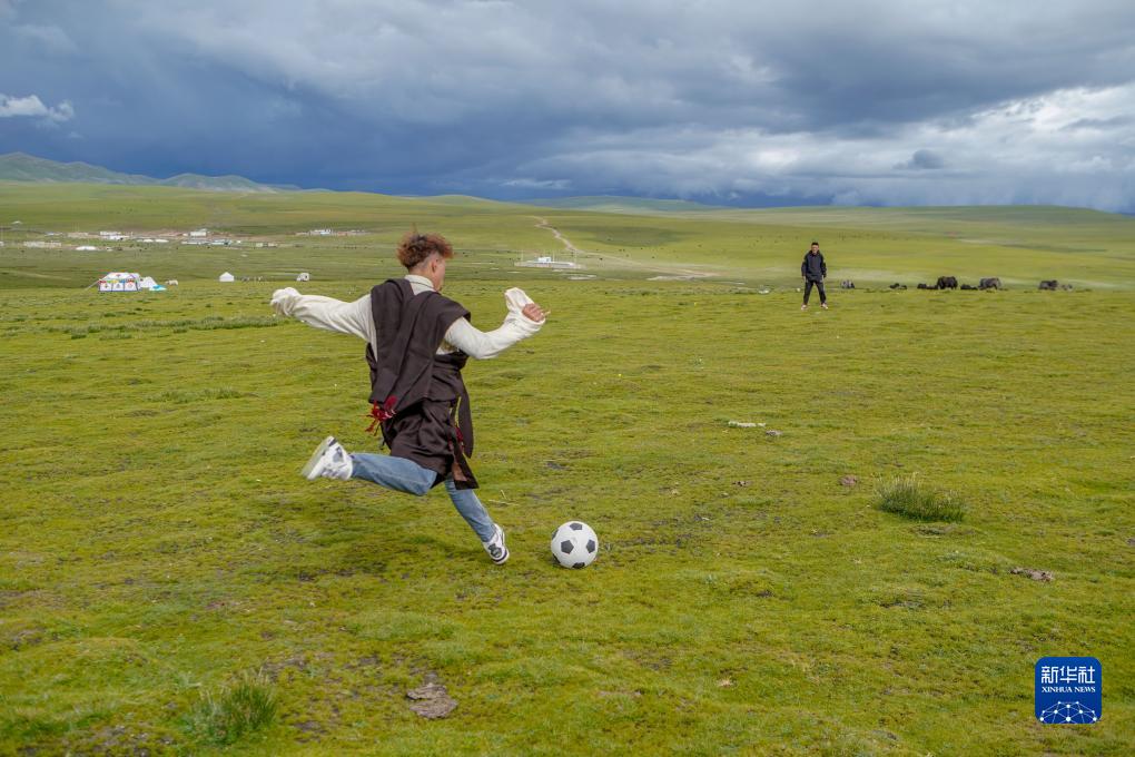 8月11日,旦增旺久和朋友在草原上踢足球。旦增旺久是次扎达儿子列热觉旦的表哥,远在千里之外的湖南上学,但还会经常想起“隆达热巴”。正值暑假,回到草原的他会细心地为“隆达热巴”梳毛,跟它说悄悄话。