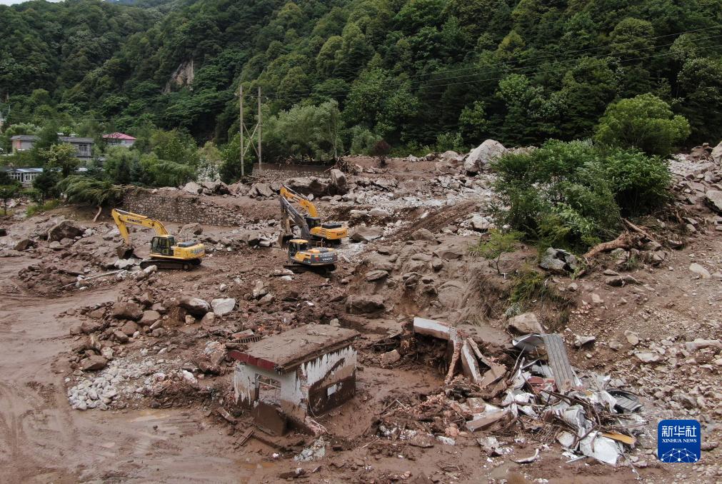 这是8月12日拍摄的西安市长安区滦镇街道喂子坪村鸡窝子组山洪泥石流灾害现场(无人机照片)。