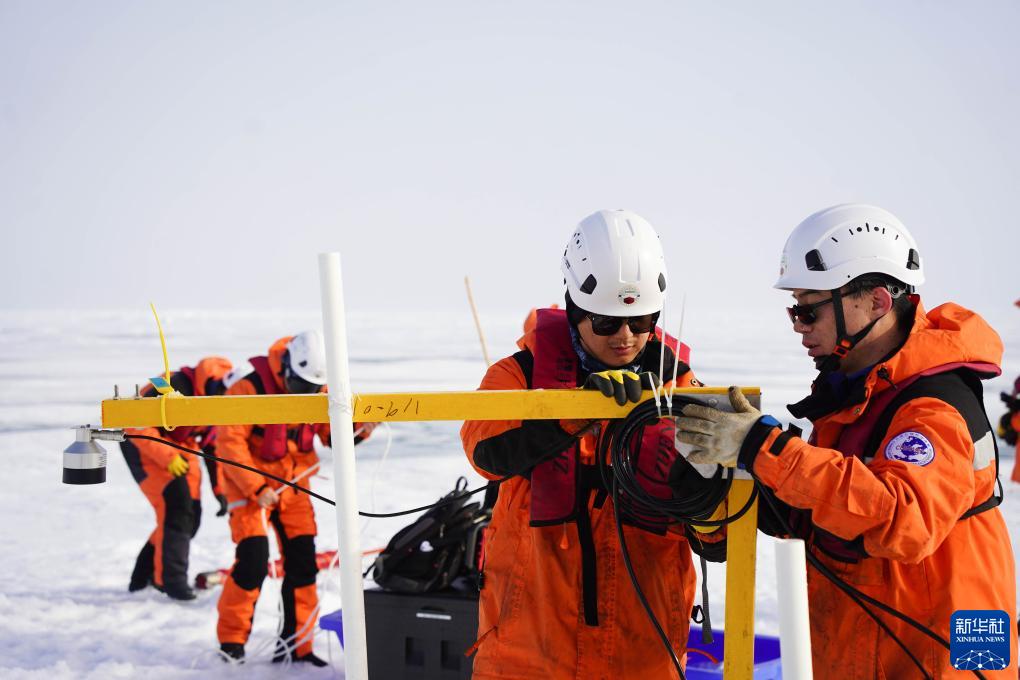 8月12日,科考队员在布放海冰物质平衡浮标。