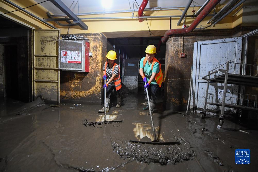 8月12日,在北京市门头沟区医院,因水灾影响无法从事原本工作的受灾群众组成清淤队伍,清理医院地下室的淤泥和垃圾。新华社记者 鞠焕宗 摄