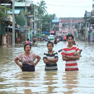 8月12日,人们在缅甸勃固镇被水淹没的道路上涉水前行。