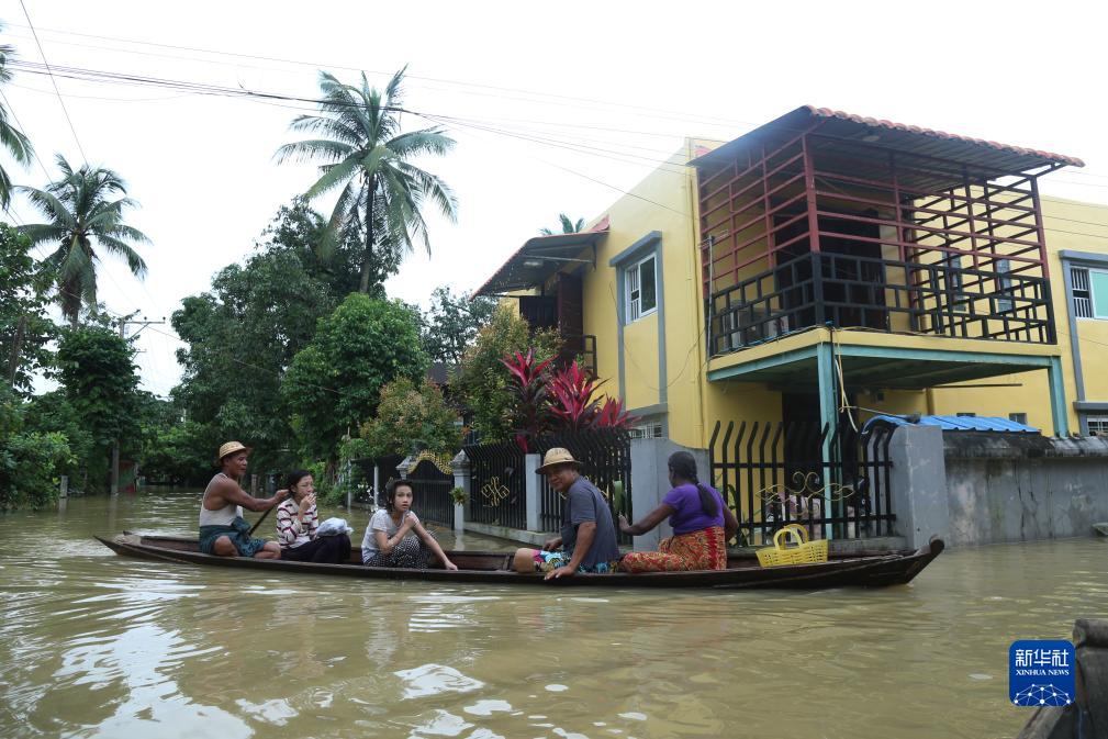 8月12日,在缅甸勃固镇洪灾区,人们乘船出行。新华社发(苗觉梭摄)