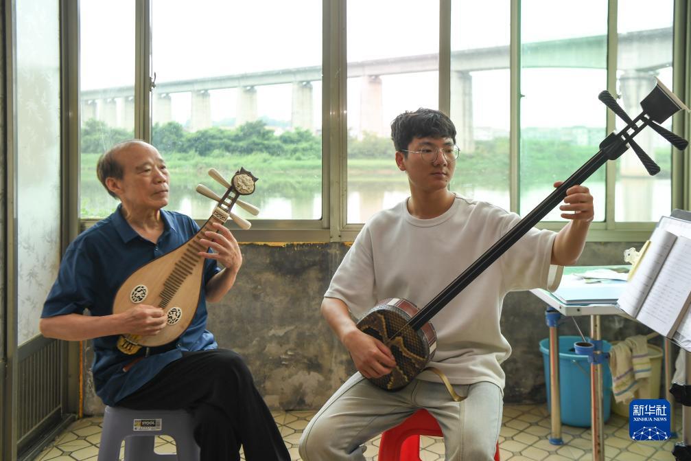 8月12日,李舒尤(左)在枧头洲村舒尤乐坊和来探望他的学生汤梁彪一起合奏。在李舒尤的指导下,汤梁彪考上了西安音乐学院,他每年假期都会探望李舒尤。
