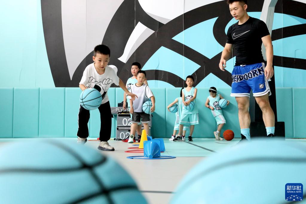 8月13日,青少年在山东省青岛市西海岸新区一篮球训练场练习。