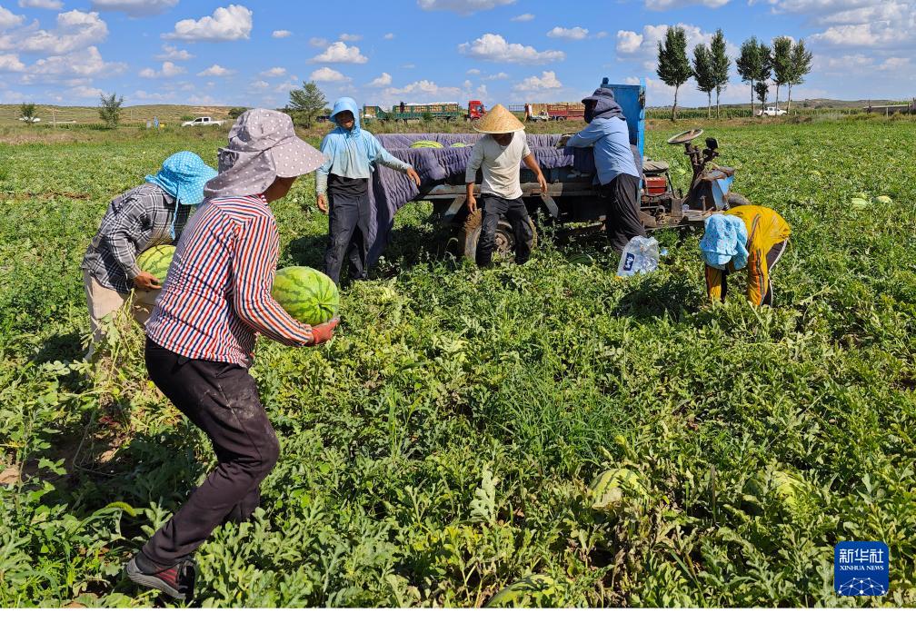 8月12日,内蒙古乌审旗无定河镇河南村农民在采摘西瓜。