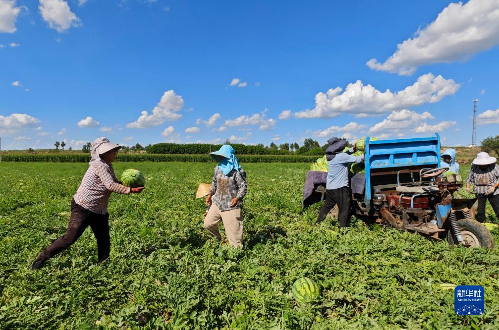 8月12日,内蒙古乌审旗无定河镇河南村农民在采摘西瓜。