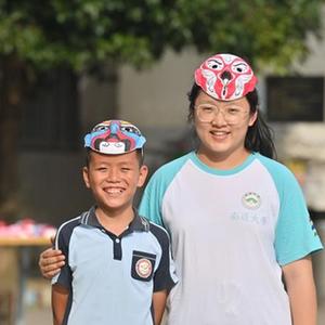 在广西融安县泗顶镇中心小学,广西科技大学学生和小学生们合影(7月18日摄)。
