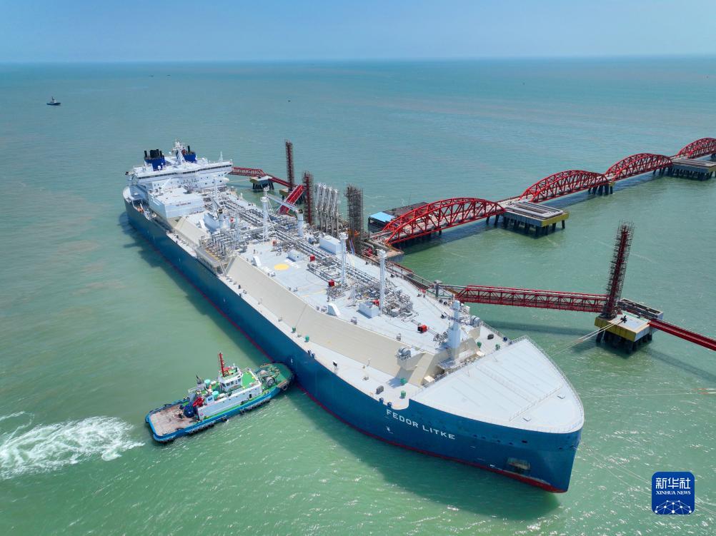 8月13日,装载着16.8万立方米LNG的塞浦路斯籍“利特克”轮靠泊位于江苏省如东县洋口港的LNG码头(无人机照片)。