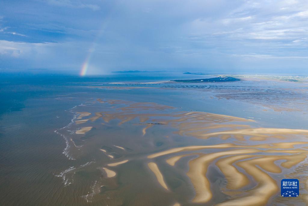 这是广西东兴市金滩彩虹景观(8月14日摄,无人机照片)。
