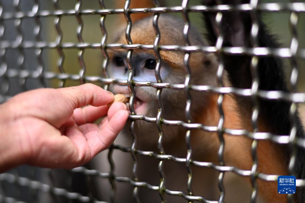 8月14日,在梵净山野生动物救护中心,工作人员给一只黔金丝猴喂食。