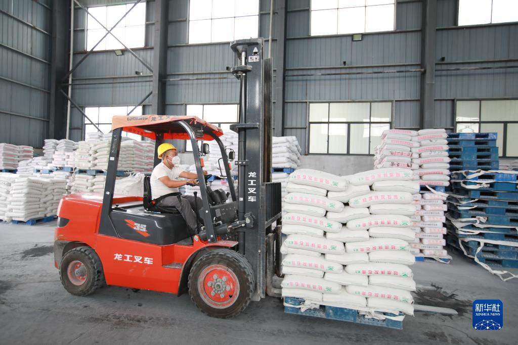 8月14日,工人在贵州磷化绿色环保产业有限公司石膏砂浆生产车间内运输。
