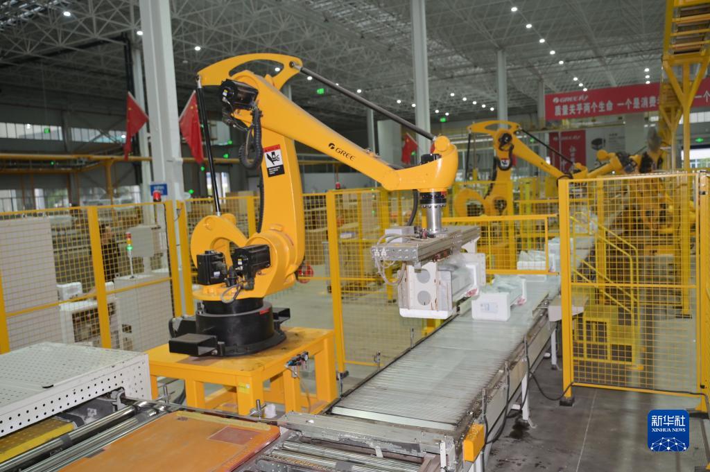 8月14日,在格力电器(赣州)有限公司,机器人在自动打包空调。