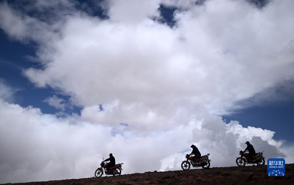 可可西里管理处卓乃湖保护站队员在卓乃湖附近骑行巡护(6月17日摄)。