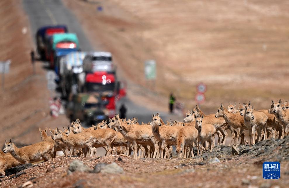 一群待产雌性藏羚羊正在通过青藏公路前往可可西里卓乃湖产仔(5月29日摄)。