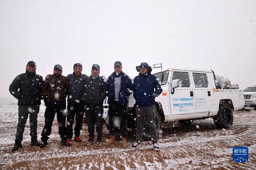 可可西里管理处卓乃湖保护站巡山队员更却罗周、尕玛成林、郭雪虎、才索加、更松多杰、尕玛扎西(从左至右)在前往可可西里卓乃湖保护站的途中留影(6月16日摄)。
