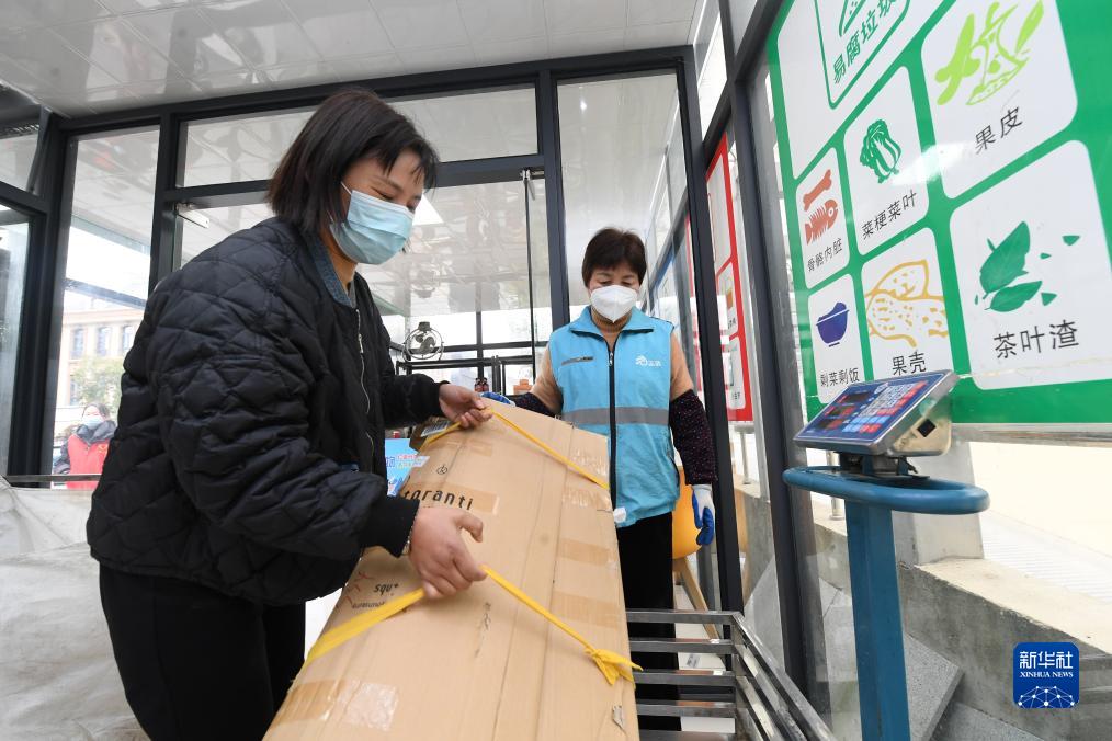 在湖州吴兴区八里店镇西湖漾社区再生资源回收站,居民将废旧纸板带来称重回收,现场结算现金(2023年2月22日摄)。