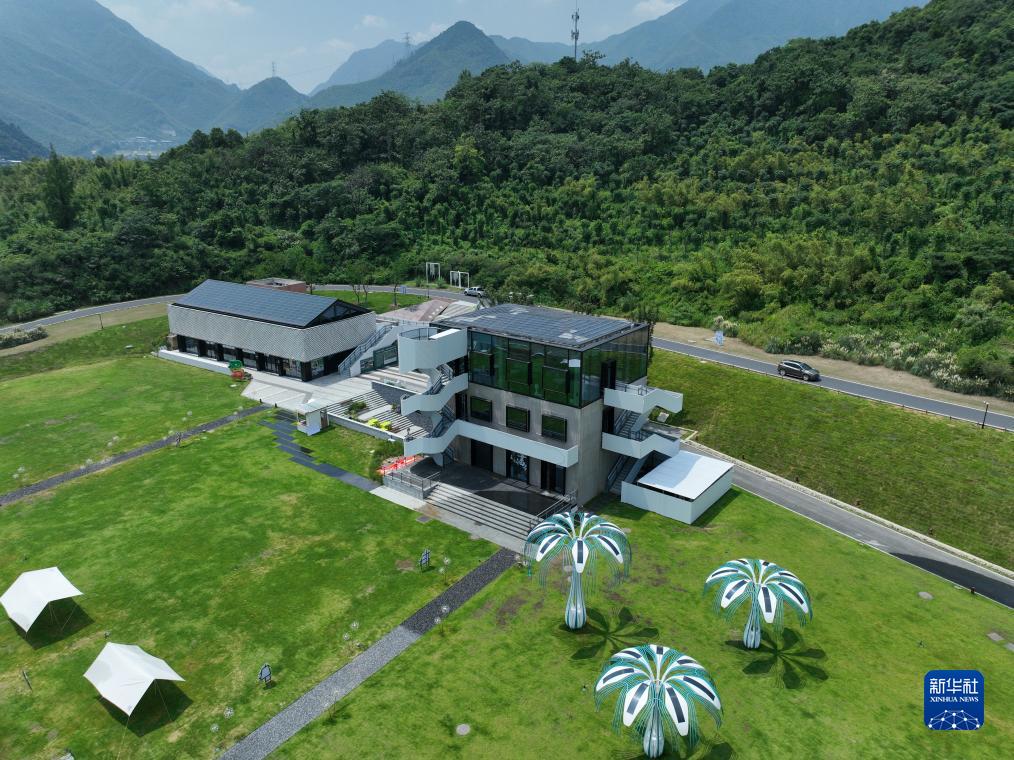 安吉余村的未来图书馆主要通过铺设在屋顶上的光伏发电系统和“光伏树”供电(8月11日摄,无人机照片)。