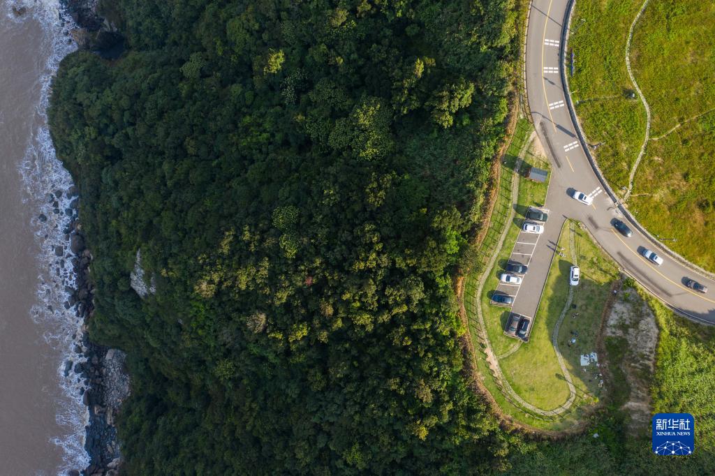 空中俯瞰临海而建的舟山普陀区螺塘线生态公路(8月6日摄,无人机照片)。螺塘线以“生态交通”为原则打造,将沿途的渔家村落、茶田、海滩、山坡、民宿等山海风光串连起来,移步换景,路景相依。