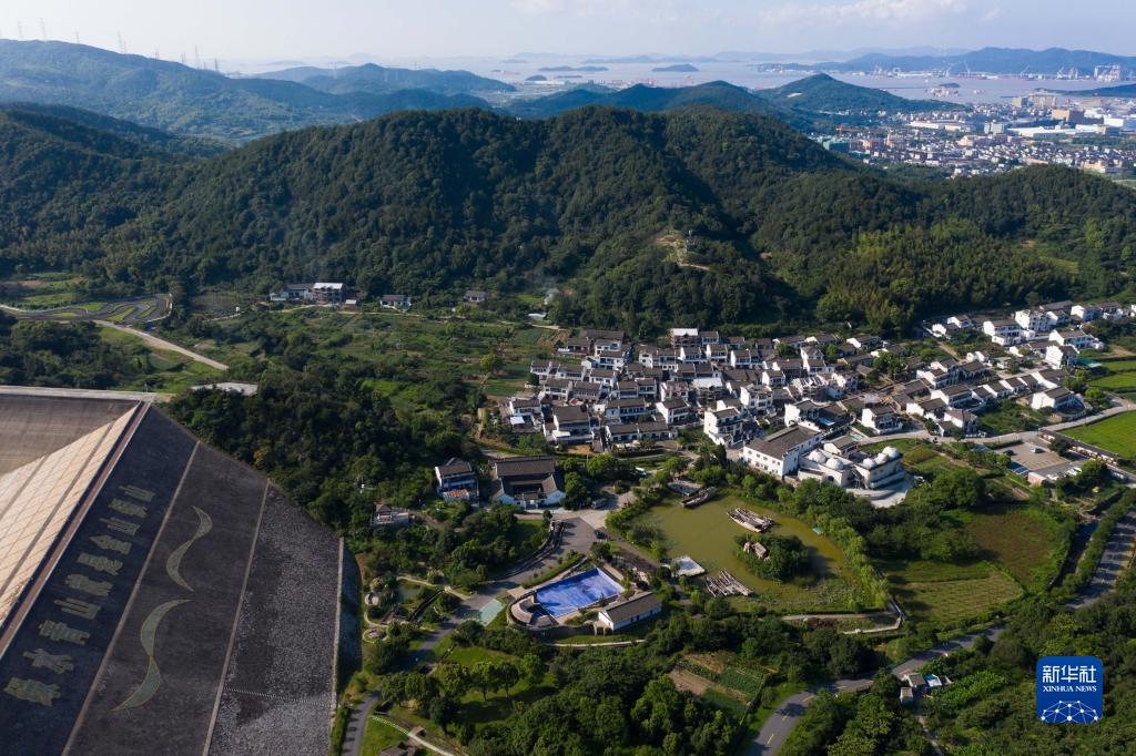 空中俯瞰舟山市定海区新建村(8月7日摄,无人机照片)。新建村被评为中国最美休闲乡村、国家级美丽宜居示范村、全国首批森林乡村、全国乡村旅游重点村等荣誉称号。