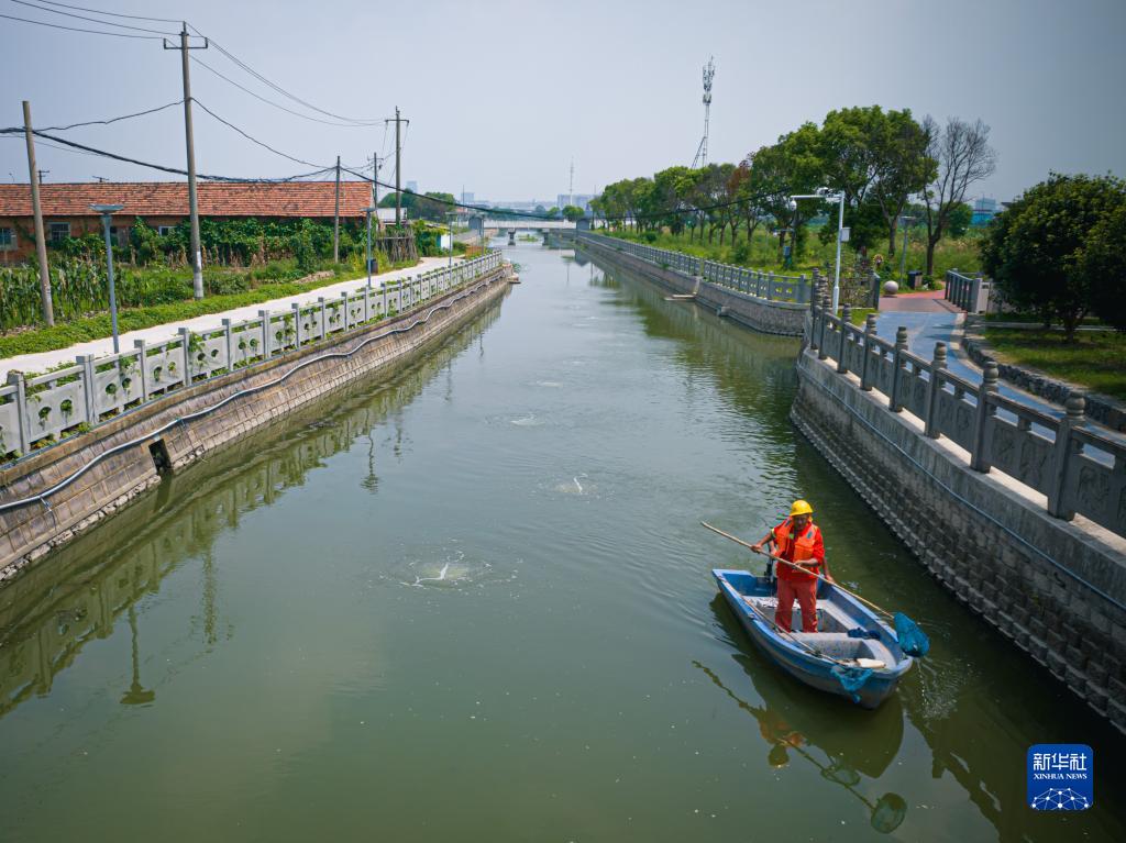 工作人员驾驶小船在宁波市江北区西大河上清理水面(8月11日摄,无人机照片)。近年来,宁波市江北区通过堤岸整治、河道清淤、建立微循环系统等方式,提高了西大河的水体自净能力和水生态环境。
