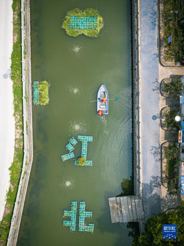 工作人员驾驶小船在宁波市江北区西大河上清理水面(8月11日摄)。近年来,宁波市江北区通过堤岸整治、河道清淤、建立微循环系统等方式,提高了西大河的水体自净能力和水生态环境。