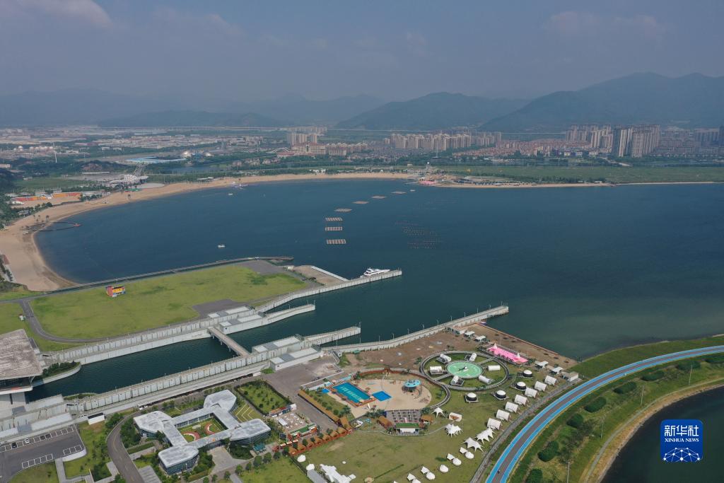 鸟瞰梅山湾沙滩公园(8月9日摄,无人机照片)。宁波市北仑区通过“陆海统筹、河海兼顾、上下联动、智慧蓝碳”治理新模式,累计投入21亿元,使曾经“海水常年混浊,泥路和荒滩遍布”的梅山湾变为一片蓝色海湾,用“金山银山”反哺“绿水青山”。