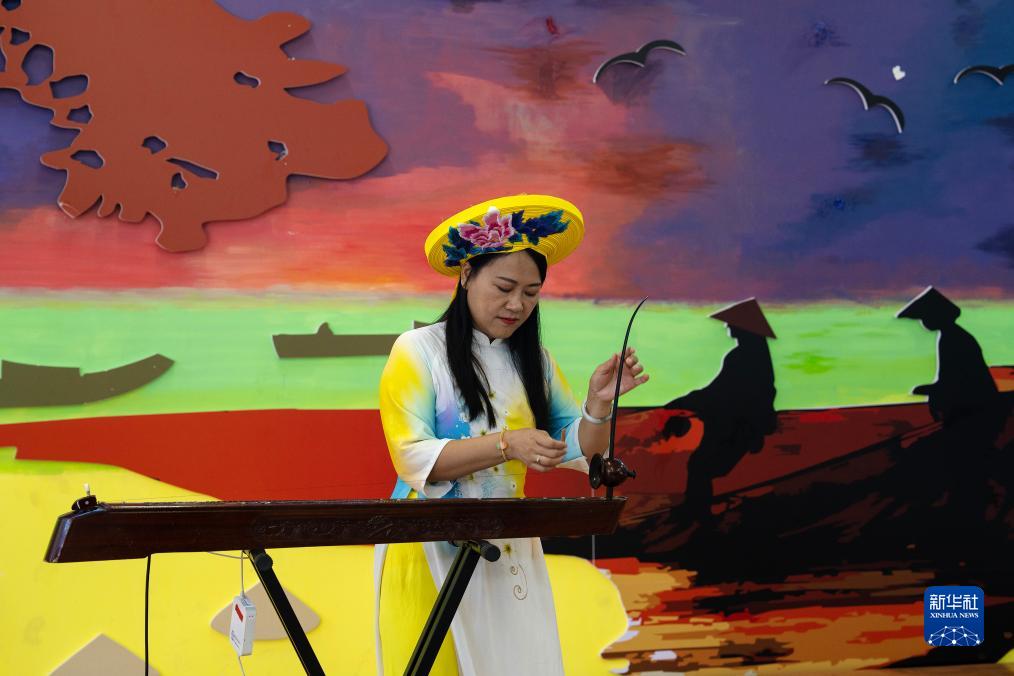 8月13日,在东兴京族博物馆,独弦琴传承人苏海珍为游客演奏。