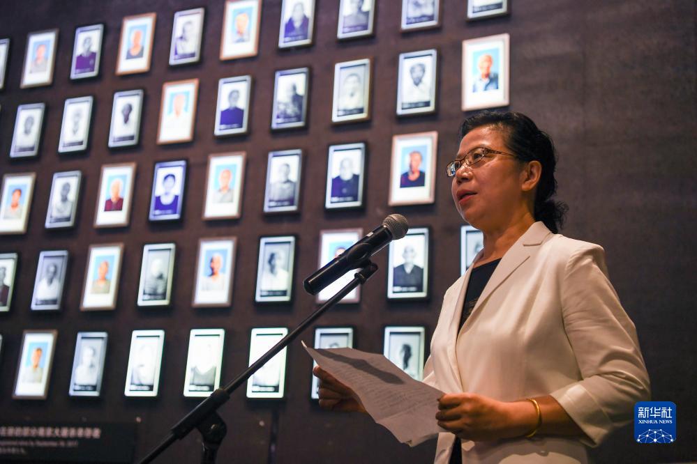 8月15日,南京大屠杀幸存者后代代表、南京大屠杀历史记忆传承人曹玉莉在活动中发言。