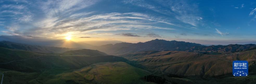 夕阳映照下的新疆昌吉市庙尔沟乡索尔巴斯陶牧场(8月13日摄,无人机全景照片)。