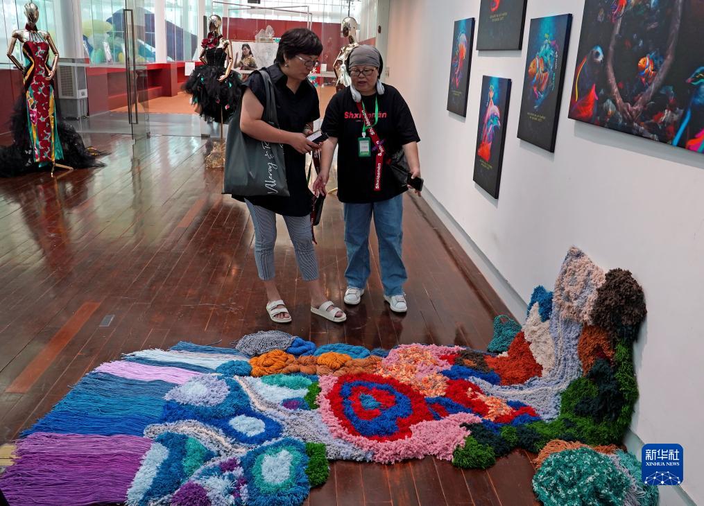 艺术节现场展示的手工作品《青山绿水》(8月15日摄)。该作品由设计师和海派钩针编结非遗传承人共同创作,呼吁人们保护山河草木。