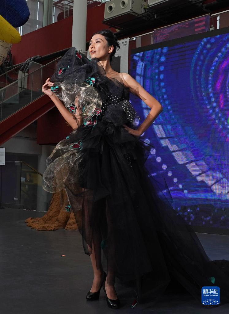 8月15日,模特在艺术节开幕式上展示用废弃布料设计制作的礼服。
