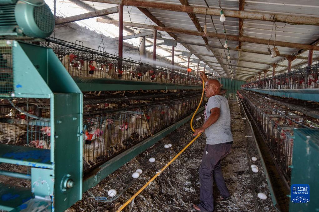 8月14日,在以色列北部马尔加利奥特村一养鸡场,一名男子为鸡群喷水降温。
