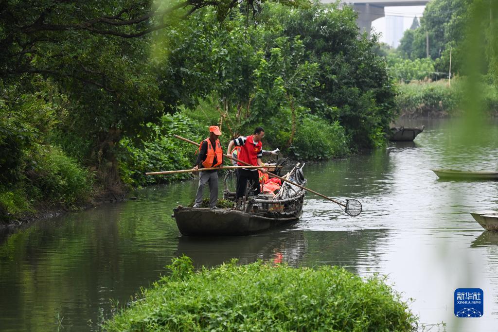 8月15日,在织里镇港西村杨家埭河段,党员志愿者和村民在河道做日常水体保洁。
