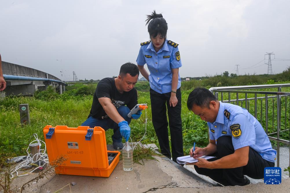 8月15日,湖州市生态环境局织里分局工作人员在织里镇振兴大桥水质监测点检测水质。
