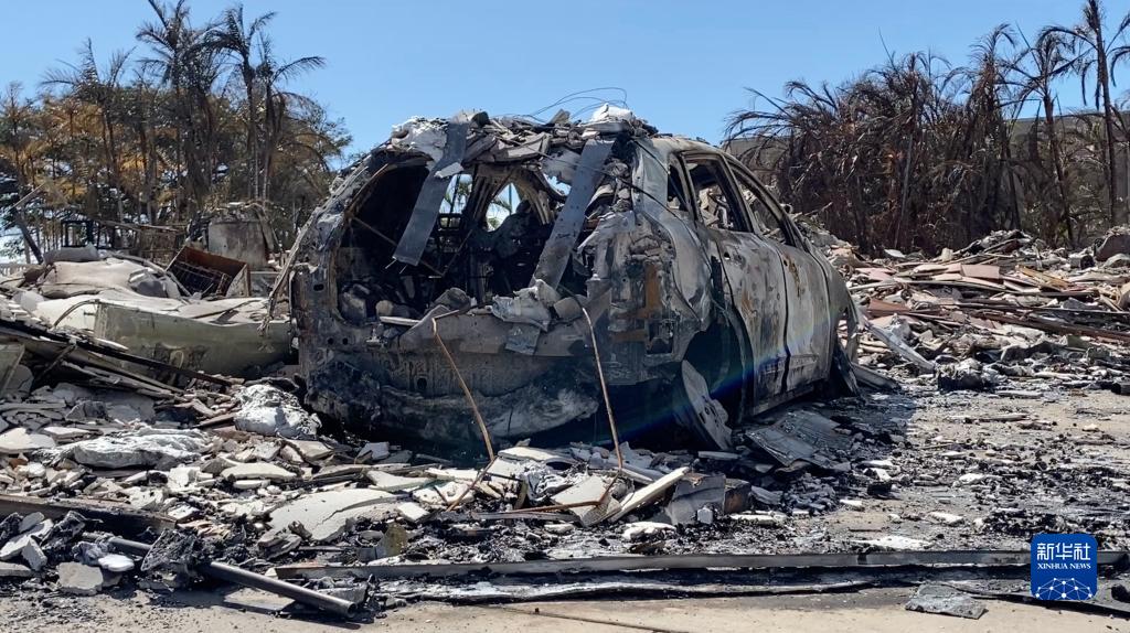 这是8月14日在美国夏威夷州毛伊岛拉海纳拍摄的野火烧毁的建筑和汽车残骸。